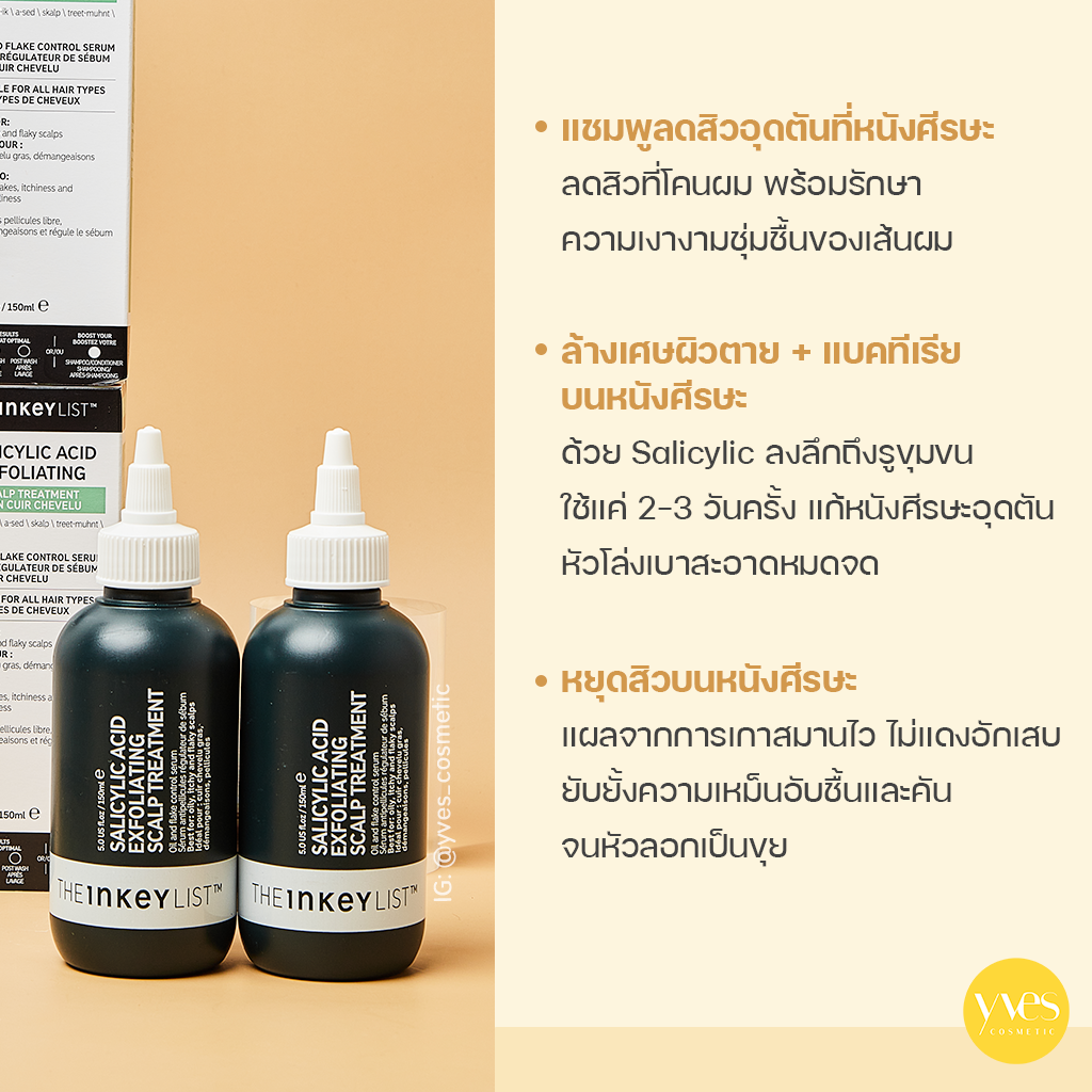 ก่อนสระผมชโลม THE INKEY LIST Salicylic Acid Exfoliating Scalp Treatment นวด ทิ้งไว้ 10 นาที แล้วล้างออก (ใช้อาทิตย์ละ 1-2 ครั้ง) และสระผมตามปกติ