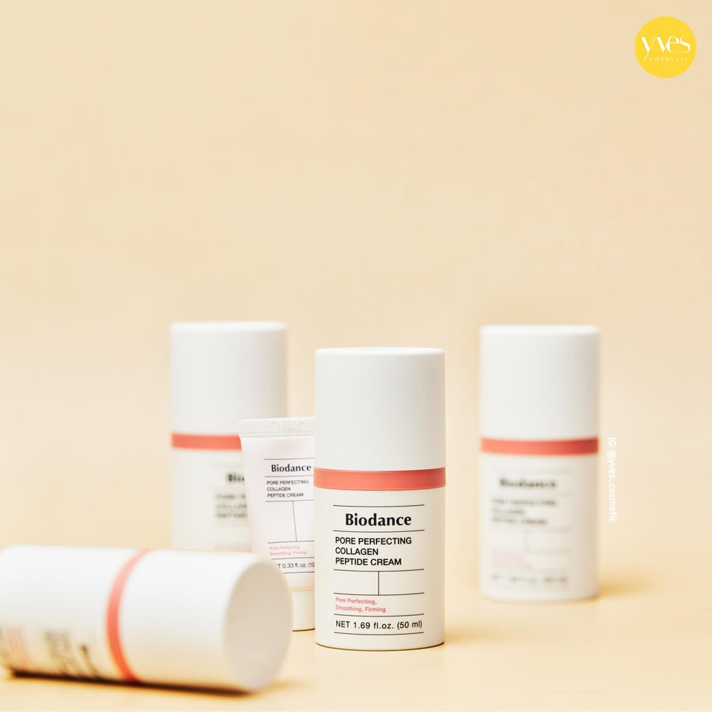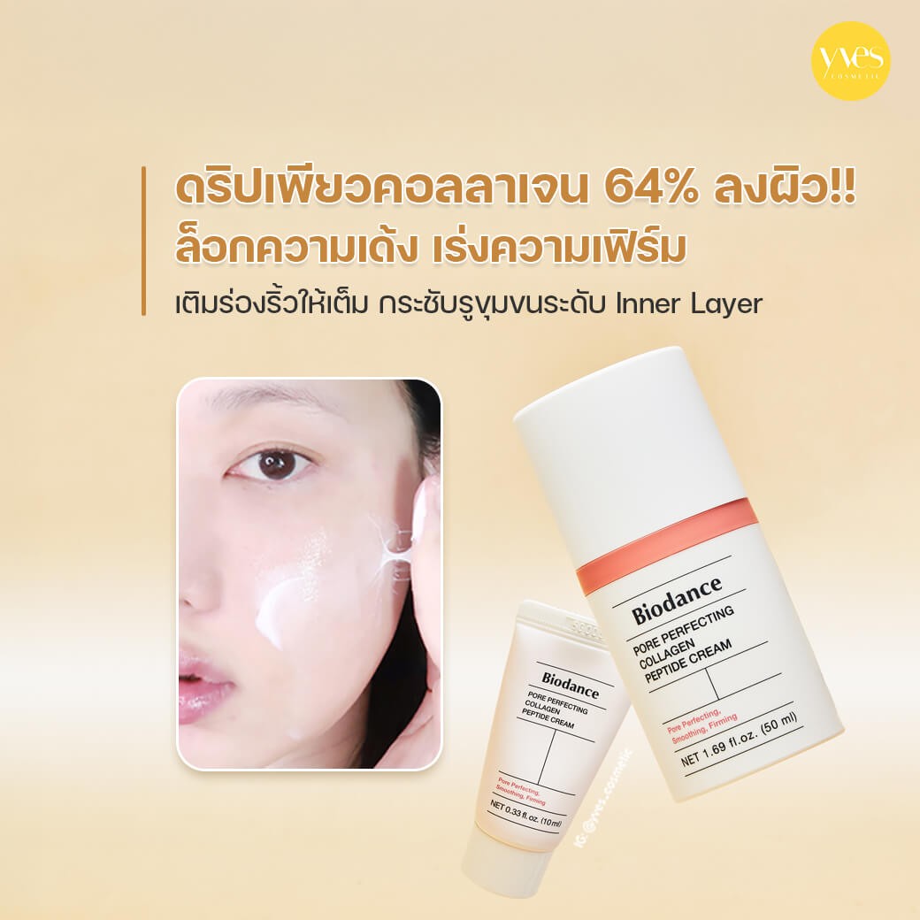 กด Biodance Pore Perfecting Collagen Peptide Cream ในปริมาณที่พอเหมาะ (ประมาณ 1-2 ปั๊ม หรือเท่าขนาดเม็ดถั่ว) สามารถใช้ได้ทั้งตอนเช้าและตอนเย็น ควรทาครีมให้ทั่วใบหน้าอย่างสม่ำเสมอ เน้นบริเวณที่มีปัญหารูขุมขนกว้างเป็นพิเศษ นวดหรือตบเบาๆ จนเนื้อครีมซึมซาบเข้าสู่ผิวจนหมด