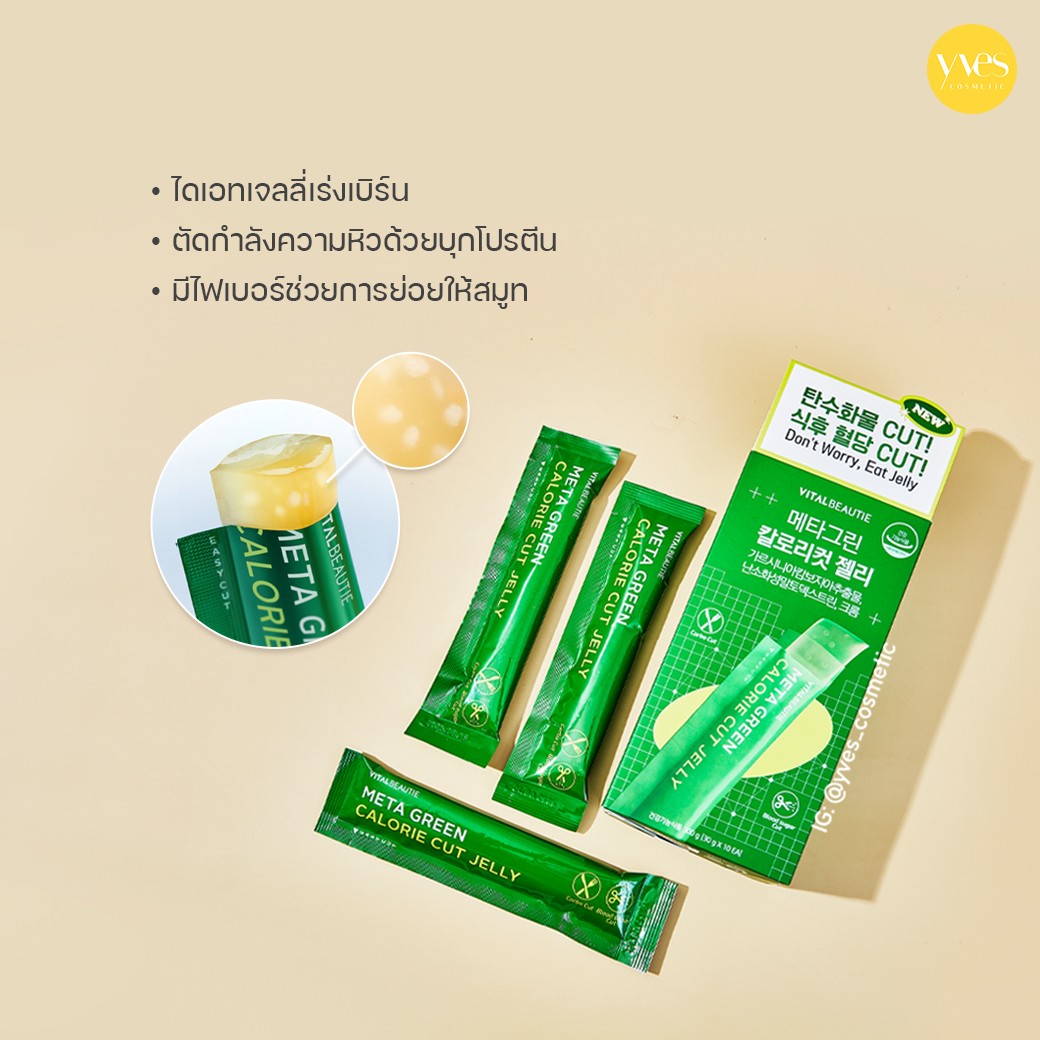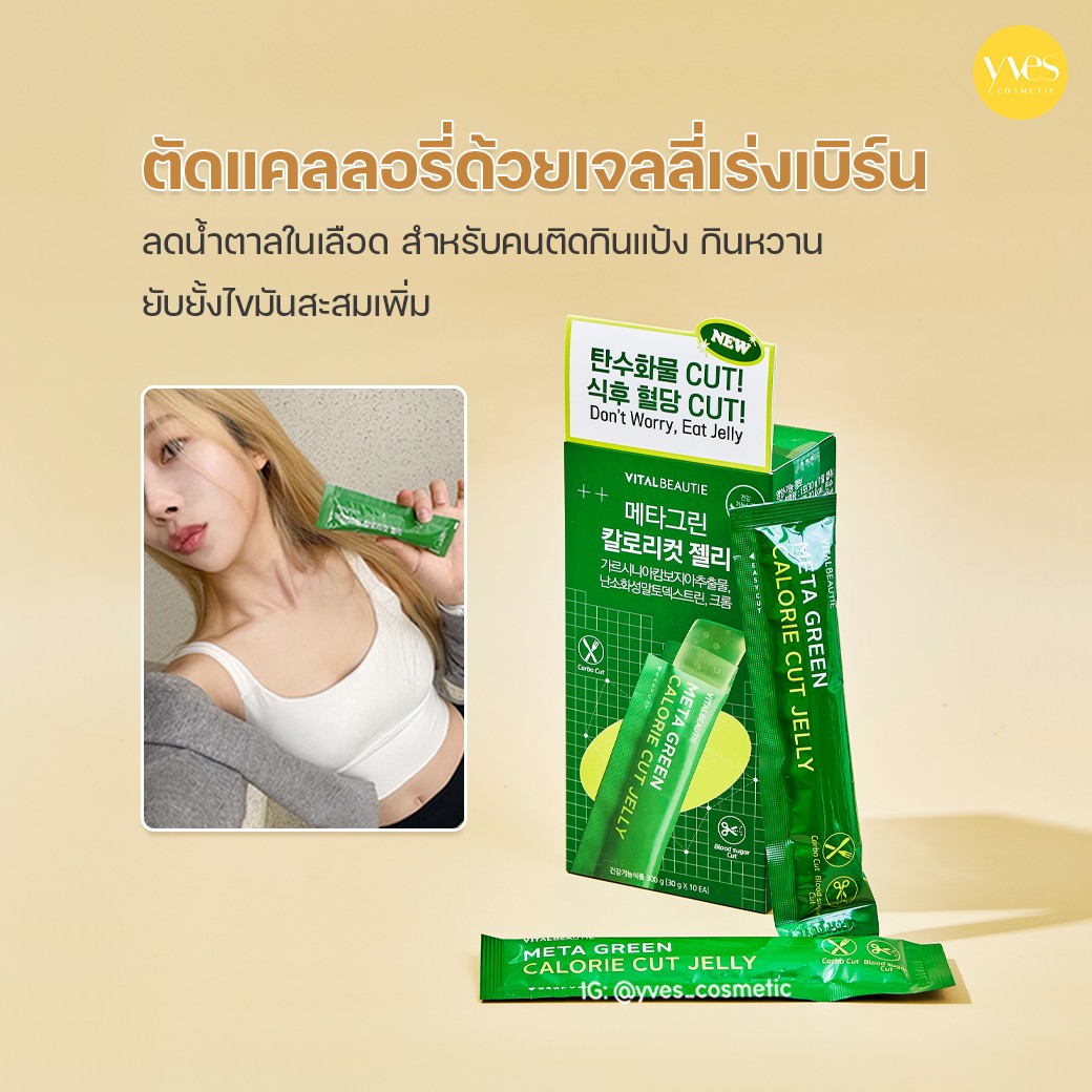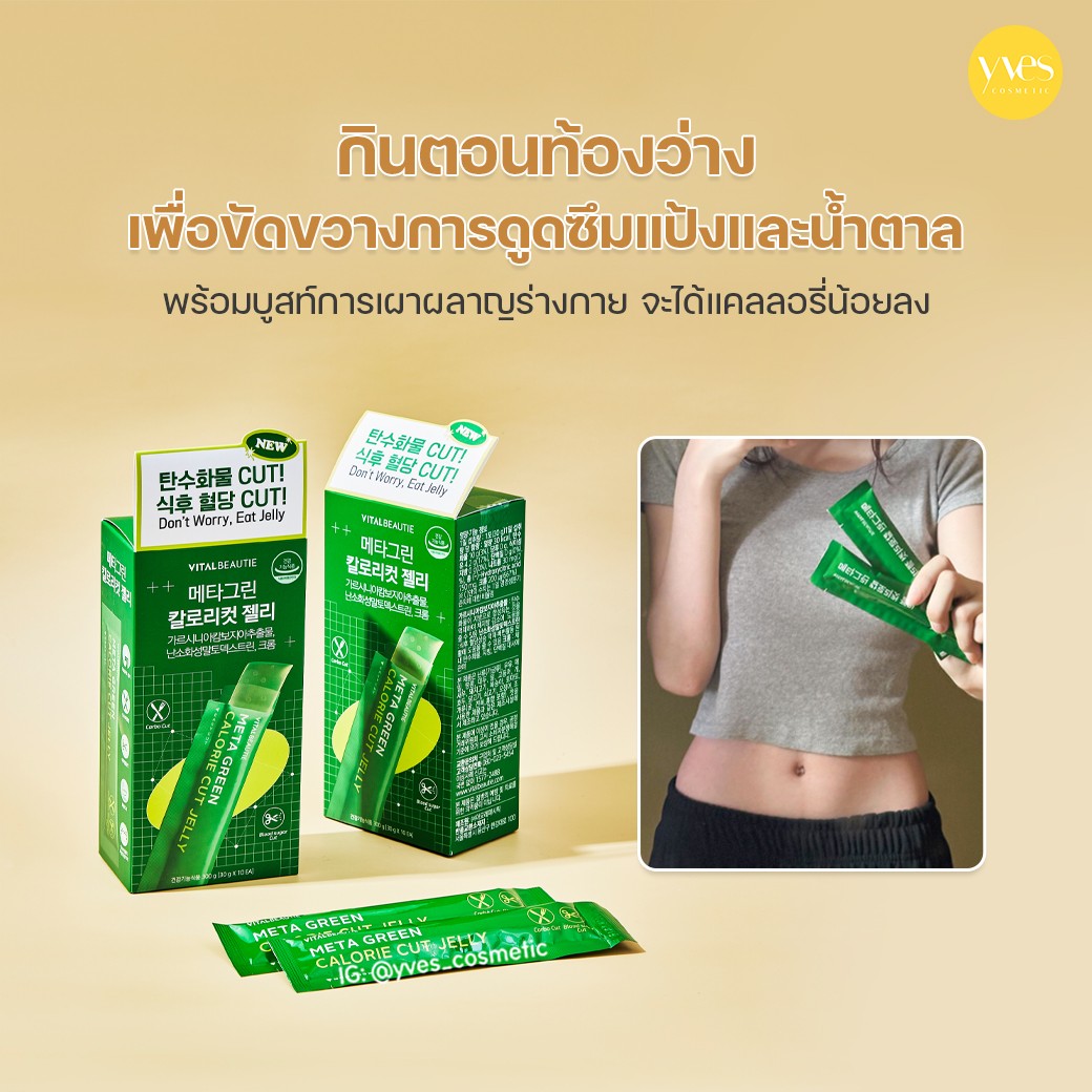 ทาน VITAL BEAUTIE Metagreen Calorie Cut Jelly วันละ 1 ซอง ก่อนมื้ออาหาร หรือทานตอนท้องว่างจะช่วยคุมหิว ให้ทานได้น้อยลง