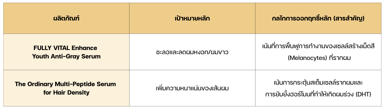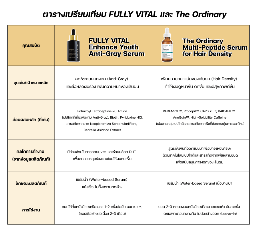 📌ถ้าปัญหาหลักคือสีผม : หากคุณกังวลเรื่อง ผมหงอกก่อนวัย และต้องการให้ผมที่งอกขึ้นใหม่มีสีเข้มตามธรรมชาติ ควรเลือก FULLY VITAL Enhance Youth Anti-Gray Serum ซึ่งมีเปปไทด์ที่เน้นการฟื้นฟูเม็ดสี