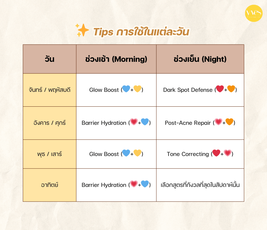 A: แนะนำให้ใช้สูตร Post-Acne Repair (🩷 PDRN + 🧡 Kojic Acid Turmeric) เพื่อซ่อมแซมผิวและลดรอยสิว สลับกับสูตร Glow Boost (🩵 Hyaluronic Acid + 💛 Vita C) เพื่อเพิ่มความกระจ่างใสค่ะ