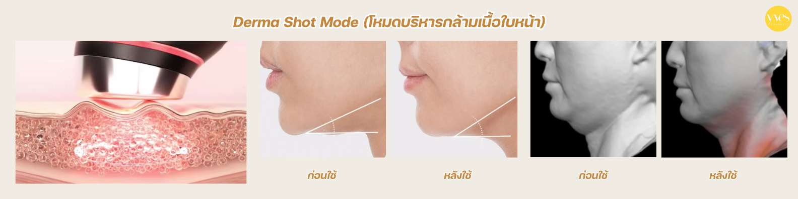 • Derma Shot Mode (EMS) : กระตุ้นกล้ามเนื้อใบหน้า, ช่วยยกกระชับผิวที่หย่อนคล้อย ให้ใบหน้าดูเฟิร์มขึ้น