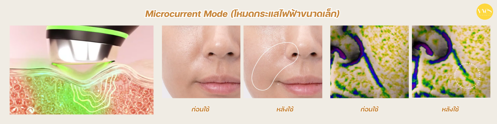 • MC Mode (Microcurrent) : กระตุ้นคอลลาเจน, ช่วยยกกระชับกรอบหน้า, ลดริ้วรอย, และเพิ่มวอลลุ่มให้ผิว