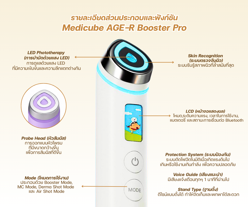 • Air Shot Mode (Electric Needles) : กระตุ้นการผลัดเซลล์ผิว, กระชับรูขุมขนให้เนียนขึ้นอย่างมีประสิทธิภาพ